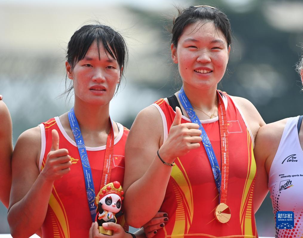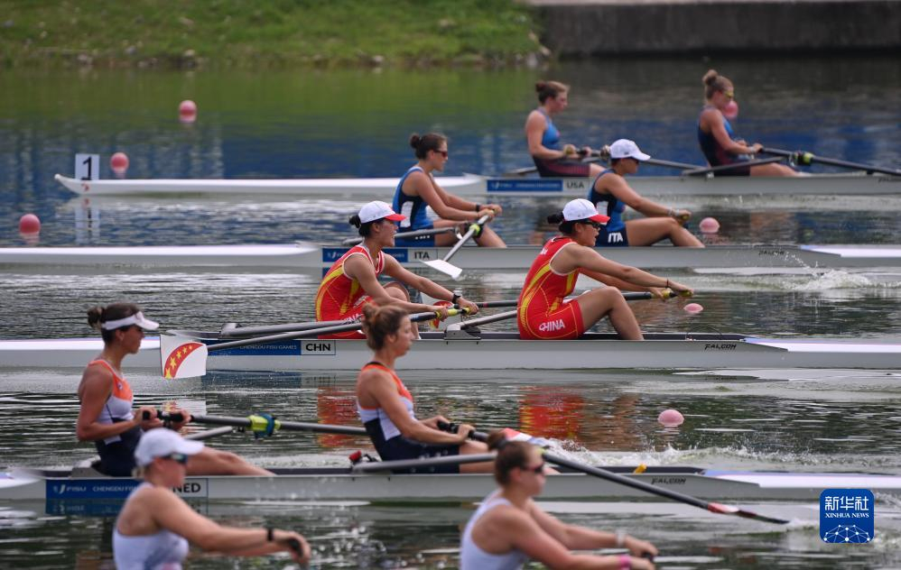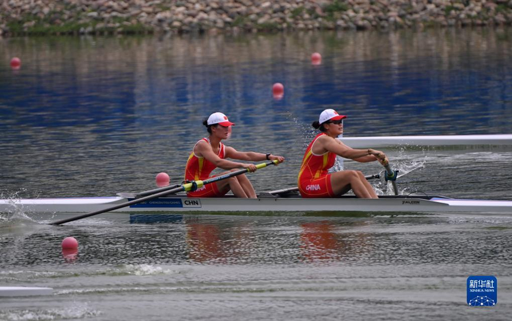 船槳齊動,劈波斬浪。8月6日,在成都舉行的第31屆世界大學生夏季運動會賽艇項目女子雙人單槳決賽中,中國組合周羽秀、張佩歆以7分31秒86的成績獲得冠軍,為中國隊拿到本次大運會賽艇項目首金。