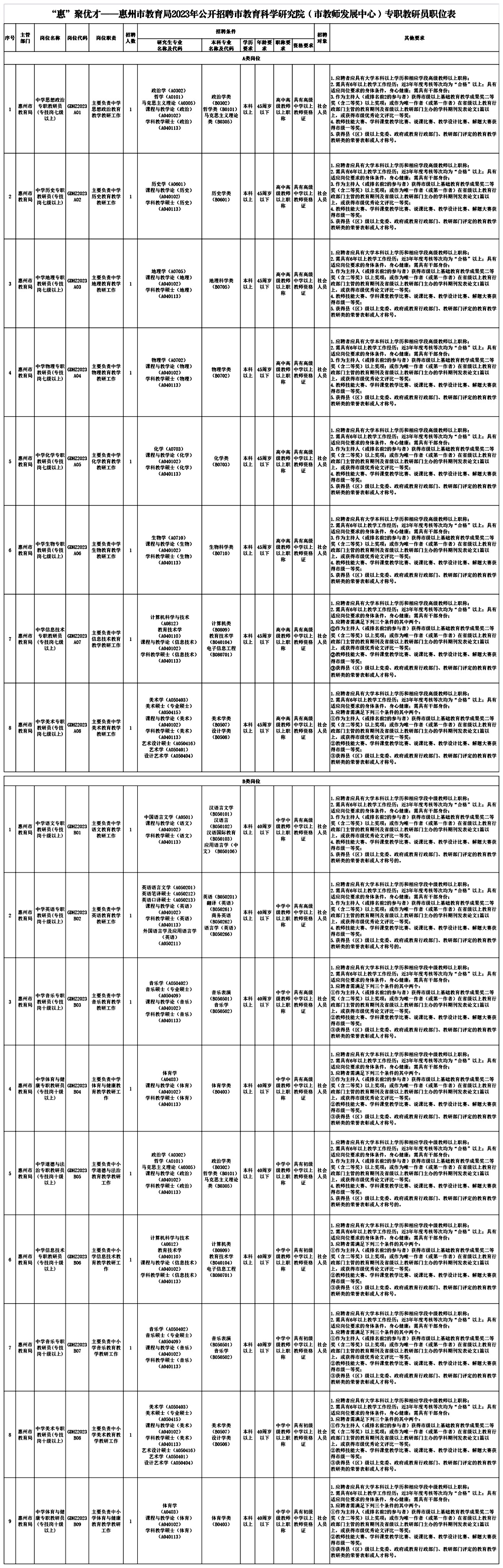 詳見《“惠”聚優(yōu)才——惠州市教育局2023年公開招聘惠州市教育科學研究院(市教師發(fā)展中心)專職教研員職位表》(附件1)。