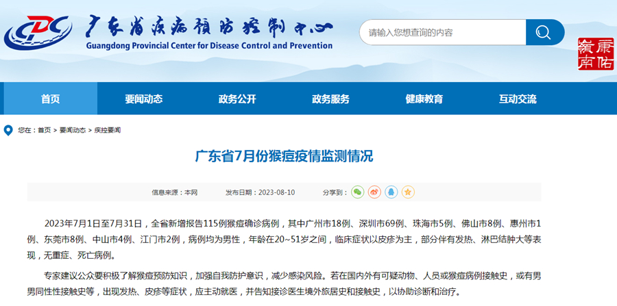 2023年7月1日至7月31日,全省新增報(bào)告115例猴痘確診病例,其中廣州市18例、深圳市69例、珠海市5例、佛山市8例、惠州市1例、東莞市8例、中山市4例、江門市2例,病例均為男性,年齡在20~51歲之間,臨床癥狀以皮疹為主,部分伴有發(fā)熱、淋巴結(jié)腫大等表現(xiàn),無重癥、死亡病例。