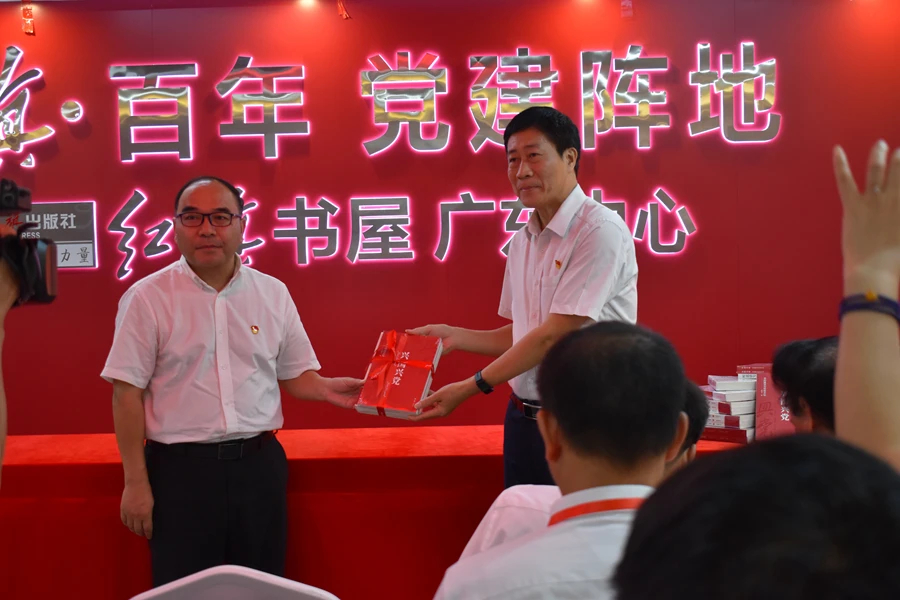 紅旗出版社社長、《非公有制企業(yè)黨建》雜志總編輯褚定華,市委組織部、市委宣傳部相關(guān)負責人等為“紅旗書屋”廣東中心揭牌。