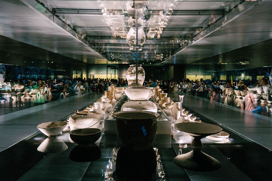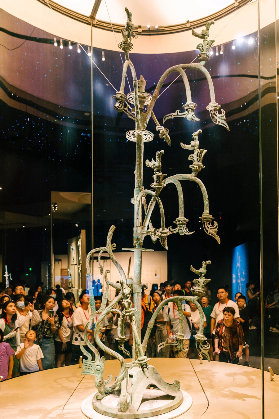 館內(nèi)大量應用數(shù)字化技術與科技融合技術,將歷史與未來相結合。以騎獸頂尊人像為例,便是由出自二號坑的銅尊口沿、出自三號坑的銅頂尊跪坐人像和出自八號坑的銅神獸組合而成。科研人員利用新科技手段,用三星堆8個“祭祀坑”出土的青銅器,還原了3000年前的“奇妙組合”,如此既滿足文物安全穩(wěn)定的展出需求,又讓觀眾能一睹文物的奇特與精美。