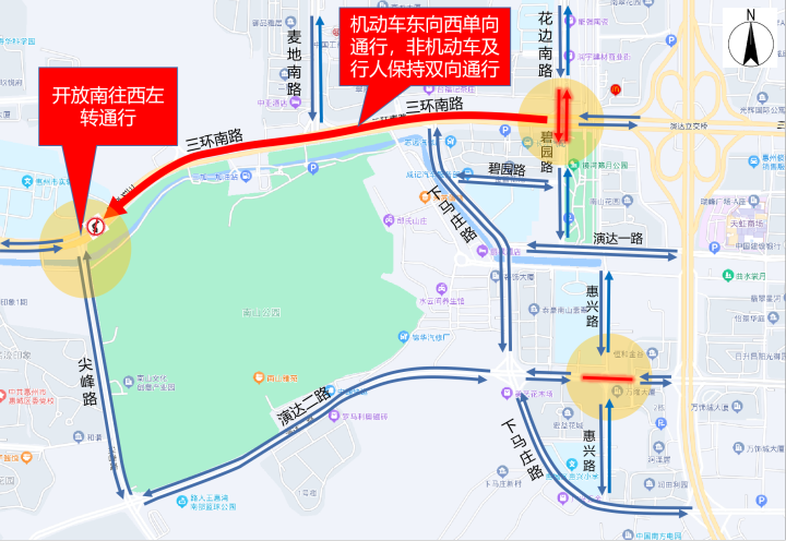 據(jù)了解,惠州市交通運(yùn)輸局正組織南山快速路工程建設(shè)施工,根據(jù)施工需要,近期將調(diào)整圍蔽三環(huán)南路等部分車道進(jìn)行施工作業(yè)。為確保施工期間道路交通安全、暢通、有序,惠州市公安局交警支隊根據(jù)《中華人民共和國道路交通安全法》等有關(guān)法律法規(guī),對三環(huán)南路及其周邊道路實施第二階段臨時交通組織。