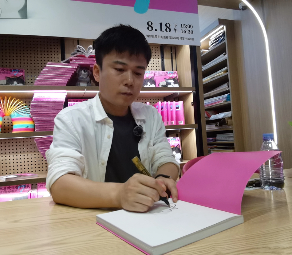 見面會一開場,白茶就稱贊惠州的美食,拉近與惠州讀者的距離,“鹽焗雞特別好吃,聽說還有梅菜扣肉,下次一定要嘗一嘗。”在分享環(huán)節(jié),白茶介紹,《喜干》系列作品中分享的都是他個人生活中的感悟,用家庭情景劇式的小幽默,給予讀者暖心和治愈。現(xiàn)場,白茶也分享了他養(yǎng)寵物的心得,并寄語養(yǎng)寵物或想養(yǎng)寵物的讀者,“與寵物相處要有包容心和責任心。”