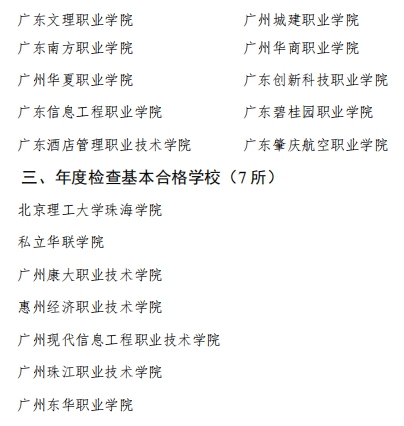 根據(jù)《廣東省教育廳關于民辦高等學校年度檢查實施辦法(試行)》,民辦高等學校(含民辦普通高校和獨立學院)均應接受年檢。年檢的主要內容為黨建與思想政治工作、辦學條件、學校法人治理、辦學行為、資產和財務管理、師生權益保障等。學校年檢結果與獎勵資助、招生計劃下達和單位評先評優(yōu)等掛鉤。