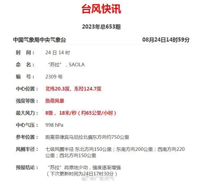 原位于菲律賓以東的西北太平洋洋面上的熱帶低壓已于24日14時(shí)加強(qiáng)為今年第9號(hào)臺(tái)風(fēng)“蘇拉”(熱帶風(fēng)暴級(jí),英文名:Saola,來(lái)源:越南,意義:一種動(dòng)物),其中心位于廣州市東南方向約1200公里,也就是北緯20.3度、東經(jīng)124.7度,中心附近最大風(fēng)力8級(jí)(18米/秒),中心最低氣壓998百帕。預(yù)計(jì),24-29日“蘇拉”路徑以原地回旋為主,強(qiáng)度逐漸加強(qiáng)。