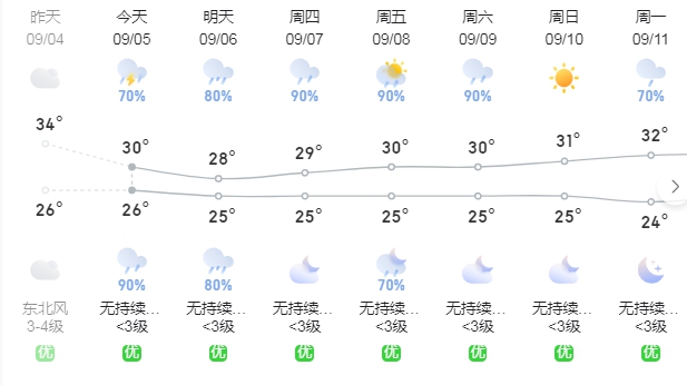 周二,多云轉(zhuǎn)中雷雨,局部暴雨,25~32℃;