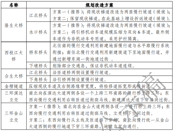 規(guī)劃總結(jié)了標(biāo)準(zhǔn)路段、平面交叉口、公交停靠站、過江橋梁和穿山隧道、立交節(jié)點(diǎn)五類慢行交通存在的問題,并且也提出相應(yīng)的改造提升方案。