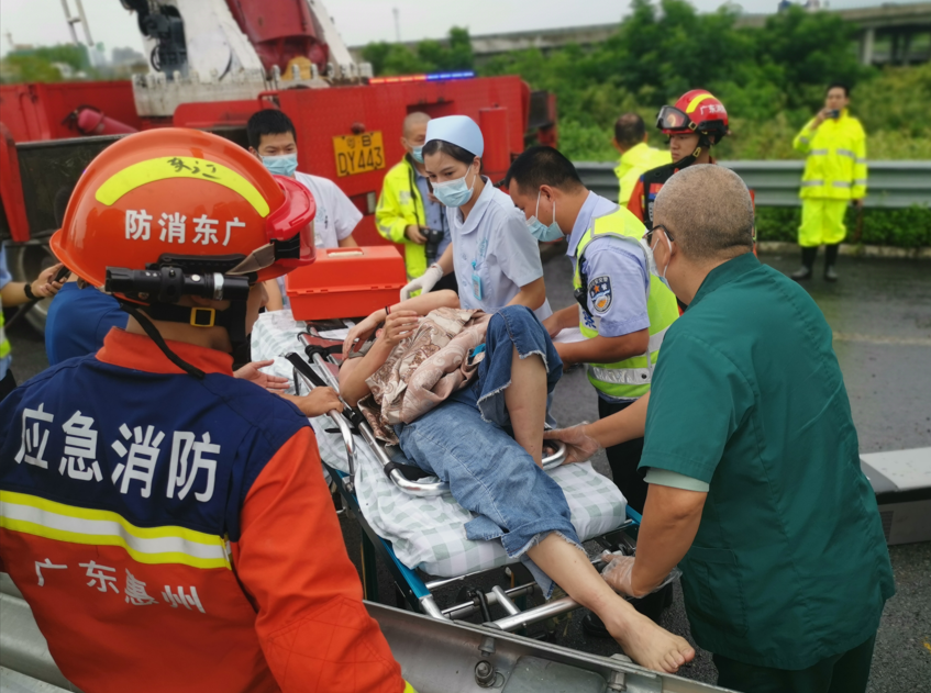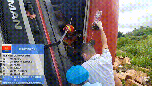 消防員立即用液壓剪切鉗對駕駛室進行破拆將一名被困人救出。并派一名隊員到副駕駛對另一名被困人員進行安撫。同時聯(lián)系吊車起吊車頭,中途再通過液壓破拆工具組給貨車破拆。經(jīng)過近一個半小時的緊急救援,兩名被困人員被救出。