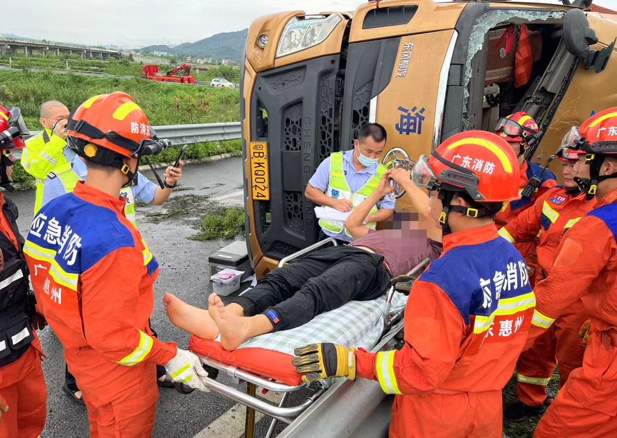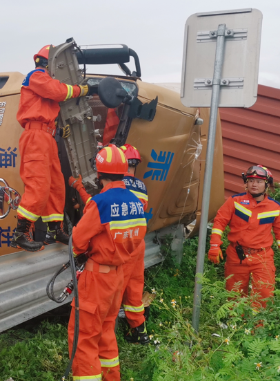 現(xiàn)場消防員發(fā)現(xiàn)一輛貨車在匯入高速主路轉(zhuǎn)彎口處側(cè)翻,貨車車頭變形,造成司機下肢被卡住無法脫身。
