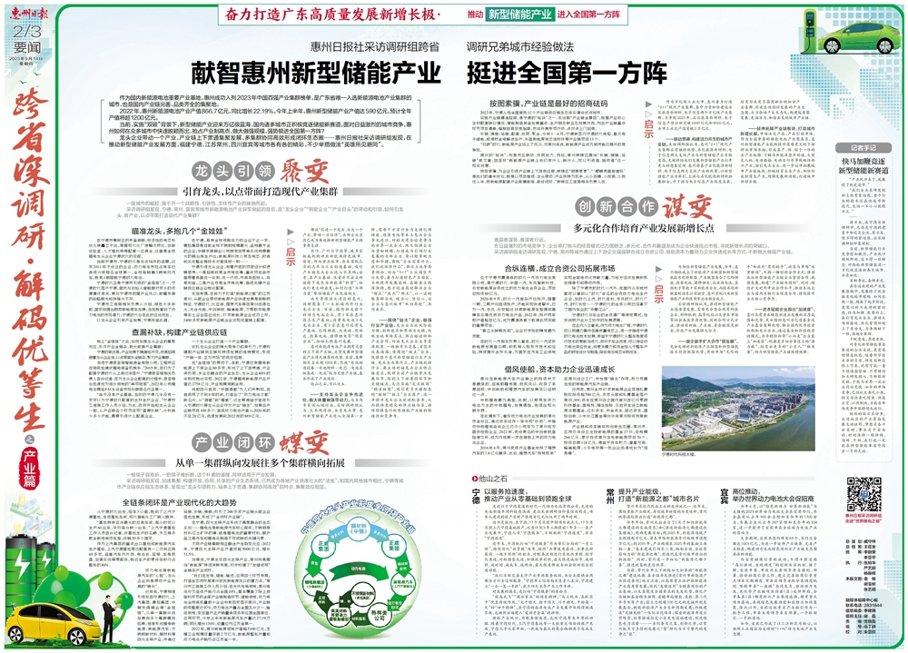 龍頭企業(yè)帶動(dòng)一個(gè)產(chǎn)業(yè)、產(chǎn)業(yè)鏈上下貫通集聚發(fā)展、多集群協(xié)同高效形成閉環(huán)生態(tài)圈……惠州日?qǐng)?bào)社采訪調(diào)研組發(fā)現(xiàn),在推動(dòng)新型儲(chǔ)能產(chǎn)業(yè)發(fā)展方面,福建寧德、江蘇常州、四川宜賓等城市各有各的精彩,不少舉措做法“英雄所見(jiàn)略同”。