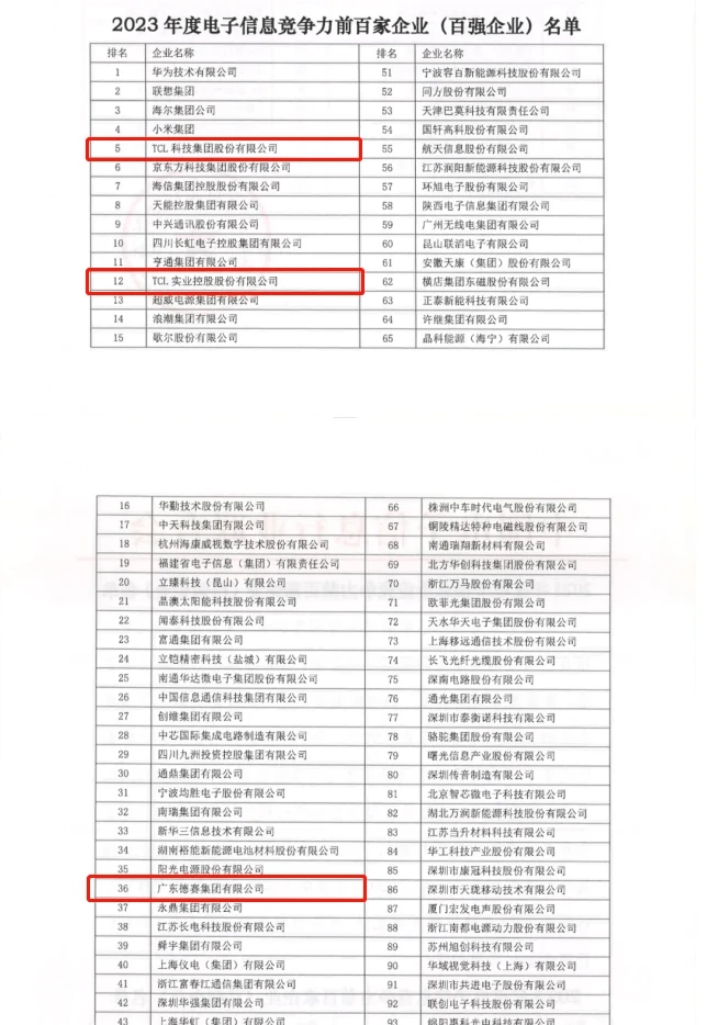 近日,中國電子信息行業(yè)聯(lián)合會在廈門發(fā)布2023年度電子信息企業(yè)競爭力報告及前百家企業(yè)名單,惠州3家企業(yè)入選。其中TCL科技穩(wěn)居榜單第5位,TCL實業(yè)首次上榜名列第12位,廣東德賽集團有限公司位列第36位。