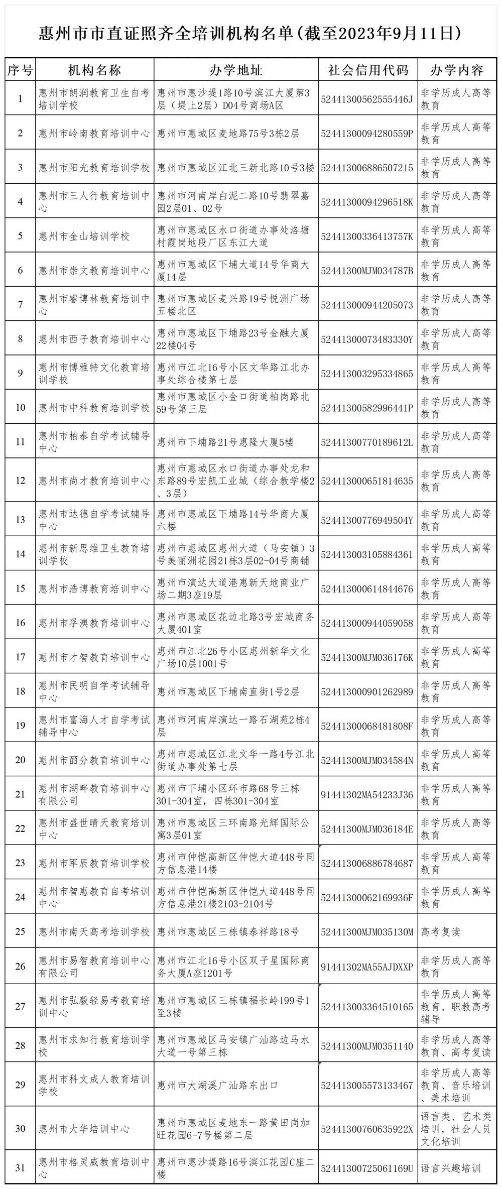 為進一步鞏固我市“雙減”工作成果,方便廣大學(xué)生及家長查詢和選擇合法合規(guī)教育培訓(xùn)機構(gòu),9月18日,惠州市教育局發(fā)布《關(guān)于公布惠州市證照齊全培訓(xùn)機構(gòu)名單的公告》,公布我市由教育行政部門審批監(jiān)管的證照齊全培訓(xùn)機構(gòu)名單(截至2023年9月11日)。