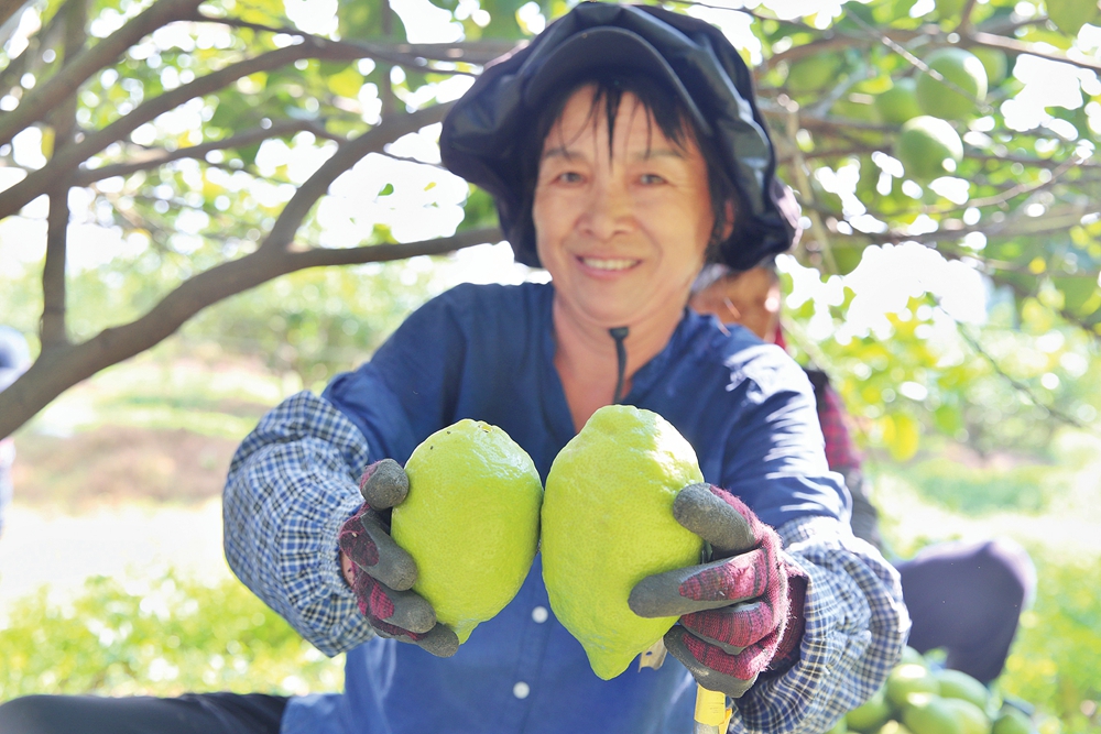 當(dāng)?shù)卮迕駰畎⒁淌遣烧犖橹械囊粏T,只見她熟練地撥開綠葉,右手拿起剪刀,在一片清脆的“咔嚓”聲中,一下就裝了滿滿一筐果子。“看,今年這些檸檬又大又靚,招人喜歡。”楊阿姨說,她八月初就來種植園采摘了,一天下來有150元收入。說話間,又有幾個果子落入她手中。