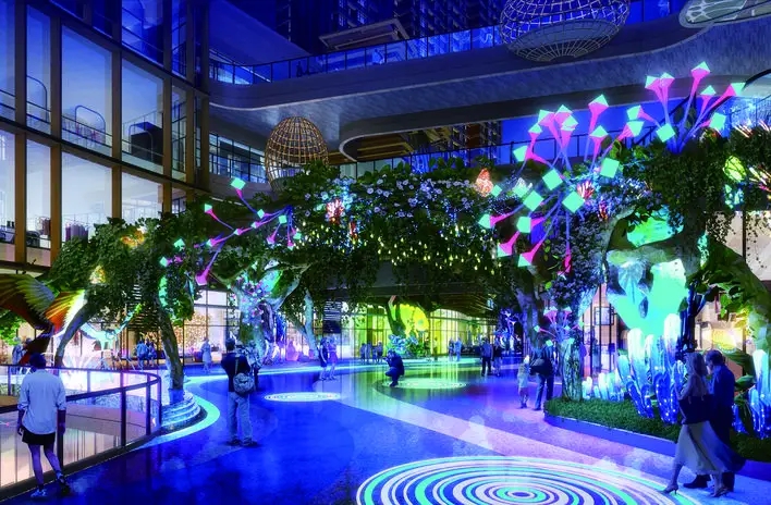 “兩街”以羅浮山文化為緣起,融合葛洪遺衣化蝶的故事,通過文化演繹、IP詮釋、綠化造景、聲光電場(chǎng)景及多媒體交互體驗(yàn)的應(yīng)用,打造情景式主題街區(qū)“蝶樹溪谷”及特色商業(yè)街“羅浮里街”,讓歷史傳說劃時(shí)空而來,造就現(xiàn)代的精彩。與此同時(shí),街區(qū)內(nèi)品牌旗艦店、特色酒吧、休閑餐飲、主題花車等業(yè)態(tài)與“兩街”場(chǎng)景相得益彰,加上潮流文化演繹中心廣場(chǎng)、購(gòu)物中心戶外IP光影劇場(chǎng)、戶外裸眼3D大屏等,斑斕多姿的生活方式將在“羅浮里”一一上演。以夜空為幕,透過光影劇場(chǎng)及多媒體交互場(chǎng)景,觀眾可隨時(shí)體驗(yàn)一場(chǎng)視覺奇幻之旅。