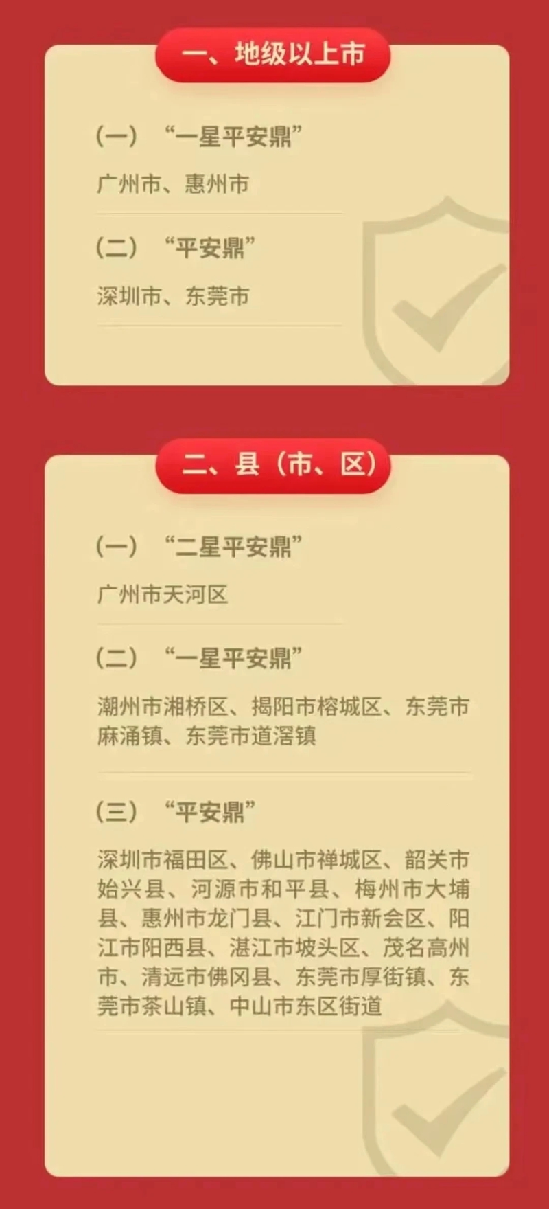 為發(fā)揮先進(jìn)示范引領(lǐng)作用,進(jìn)一步激發(fā)各地積極性、主動(dòng)性、創(chuàng)造性,全面提升平安廣東建設(shè)科學(xué)化、社會(huì)化、法治化、智能化水平,廣東首次在省級層面開展“平安鼎”頒授活動(dòng)。省委平安廣東建設(shè)領(lǐng)導(dǎo)小組辦公室決定授予廣州市、惠州市“一星平安鼎”;授予惠州市龍門縣等14個(gè)縣(市、區(qū))“平安鼎”。