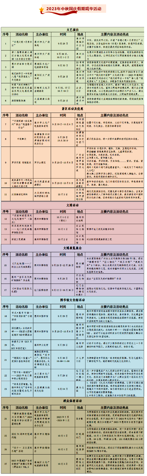 為進一步激發(fā)中秋國慶期間我市文旅體消費市場活力,我們將于9月28日啟動惠州文旅金秋消費季,推出旅游景區(qū)、酒店民宿、體育場館和非遺手信集市消費券,涵蓋一批A級景區(qū)、精品酒店民宿、體育場館和非遺主題集市活動,對市民的文旅體消費實行40%的補貼比例,讓每位市民最高可享受120元的優(yōu)惠補貼。