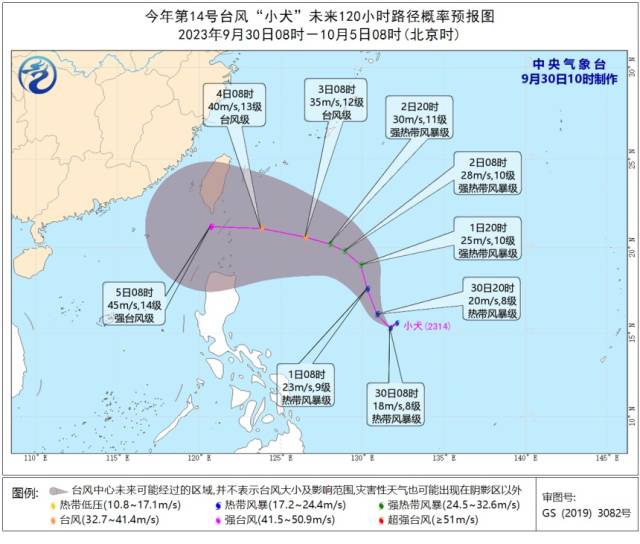 預(yù)計(jì),“小犬”將以每小時(shí)10至15公里的速度向西北方向移動(dòng),強(qiáng)度逐漸增強(qiáng),10月2日開始轉(zhuǎn)向偏西方向移動(dòng),逐漸向臺灣島南部一帶沿海靠近。按現(xiàn)有預(yù)報(bào)路徑,假期末期至復(fù)工初期,“小犬”或影響我國沿海地區(qū)。