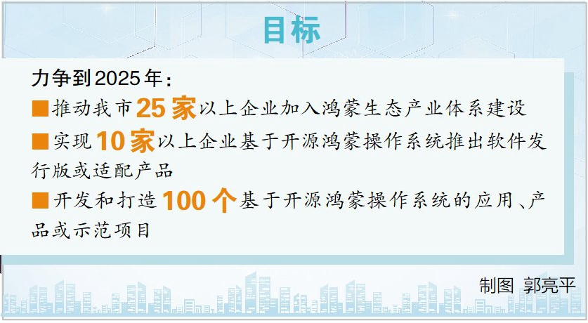 《行動(dòng)計(jì)劃》提出,力爭到2025年,推動(dòng)我市25家以上企業(yè)加入鴻蒙生態(tài)產(chǎn)業(yè)體系建設(shè),實(shí)現(xiàn)10家以上企業(yè)基于開源鴻蒙操作系統(tǒng)推出軟件發(fā)行版或適配產(chǎn)品,開發(fā)和打造100個(gè)基于開源鴻蒙操作系統(tǒng)的應(yīng)用、產(chǎn)品或示范項(xiàng)目。