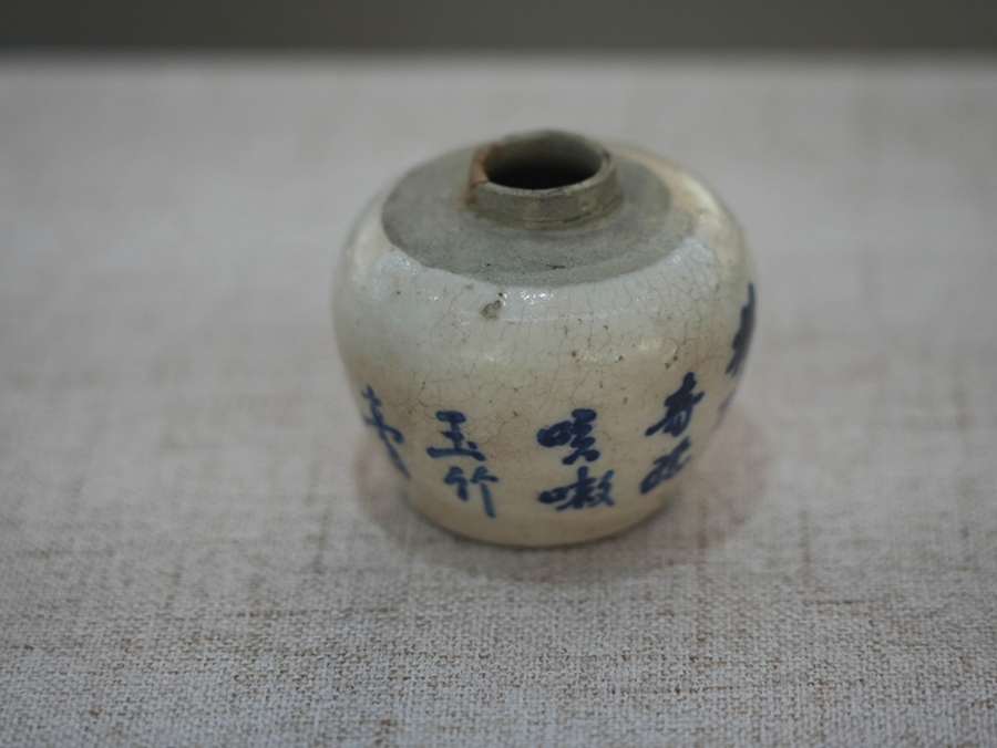 青花陶藥罐。
