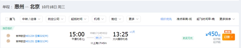 惠州飛往北京機票最低為450元