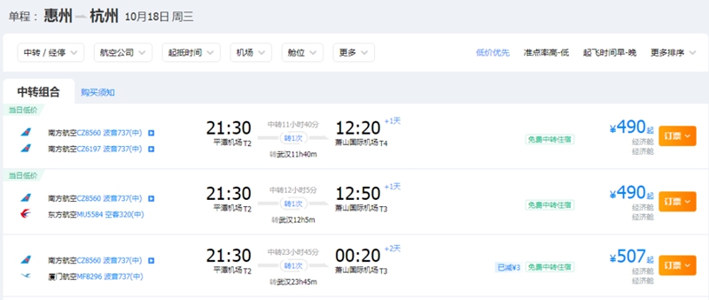 惠州飛往杭州機票價格最低為490元