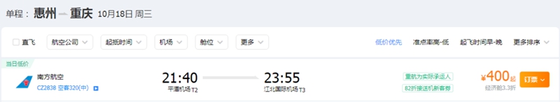 惠州飛往重慶機票價格最低為400元