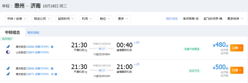 惠州飛往濟南機票價格最低為480元