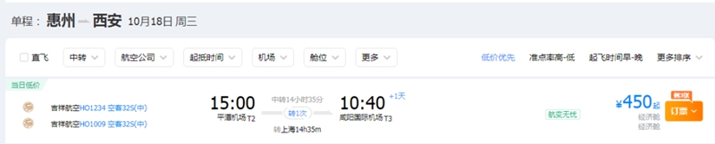 惠州飛往西安機票價格最低為450元