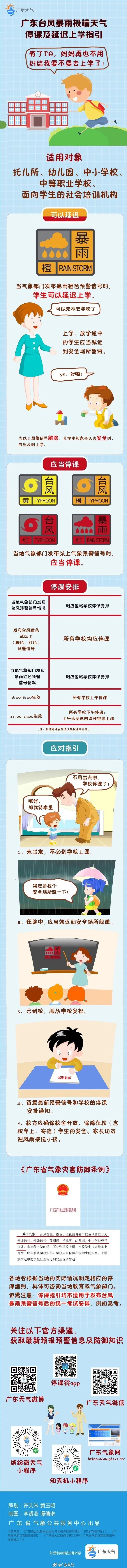 根據(jù)《廣東省氣象災(zāi)害防御條例》,當(dāng)氣象部門發(fā)布暴雨紅色預(yù)警信號(hào),可視為停課信號(hào),其生效期間,托兒所、幼兒園、中小學(xué)校、中等職業(yè)學(xué)校應(yīng)當(dāng)停課。當(dāng)暴雨橙色預(yù)警生效,學(xué)生可以延遲上學(xué),上學(xué)、放學(xué)途中的學(xué)生應(yīng)當(dāng)就近到安全場所暫避。