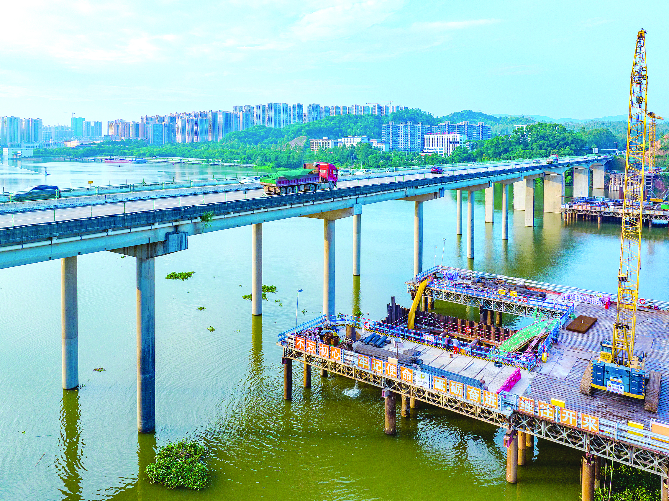 惠河高速改擴(kuò)建東江特大橋開啟水中墩身施工。 惠州日報記者戴建 通訊員劉志浩 攝