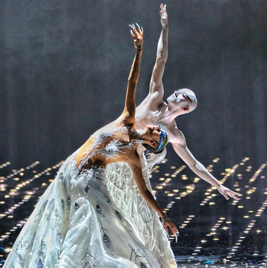 2022版舞劇《孔雀》以“生命”“愛”和“時間”為主題,通過孔雀與烏鴉的故事,呈現(xiàn)了一出由愛生羨、羨生妒、妒生恨、恨生殺、殺于死,死而涅槃再生的大自然悲喜劇。演出中,周而復(fù)始不停旋轉(zhuǎn)的“時間”,幕間穿插引導(dǎo)眾生的“神靈”,為這部劇增加舞劇的深度,引發(fā)觀眾的思考。