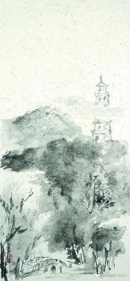 一是注重抽象與具象的結(jié)合。金旋的作品在繼承了傳統(tǒng)山水畫的基礎(chǔ)上,引入了一些抽象的元素和符號(hào),使其既有具象的形象感,又有抽象的意象感,既有山水的實(shí)體,又有山水的精神。他的作品充滿了生機(jī)與活力,通過(guò)微妙的筆墨表現(xiàn)西湖的橋、塔、樓閣,這些元素交融,構(gòu)建出一幅幅雅致、淡泊而生動(dòng)的作品。