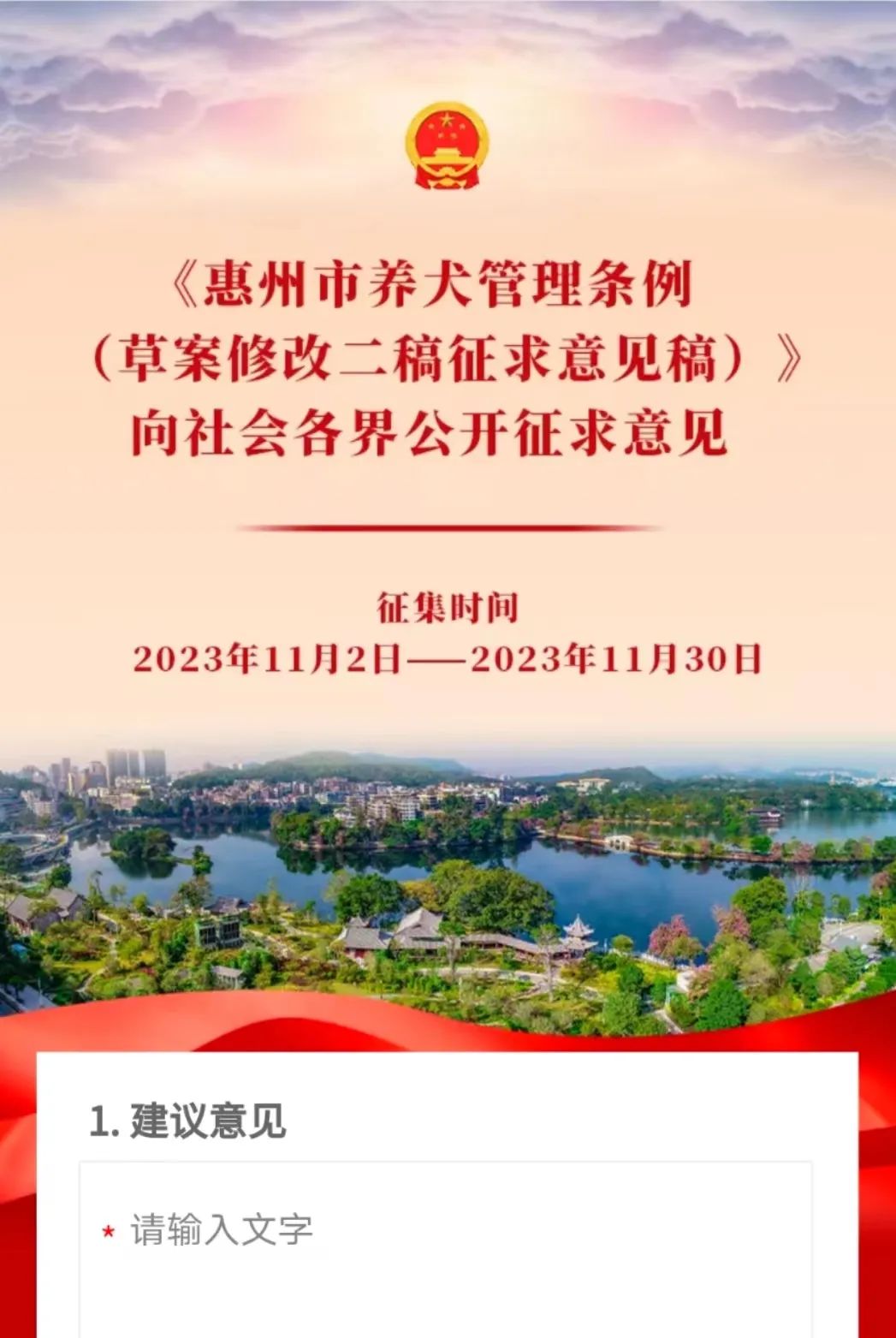 惠報(bào)全媒體記者從市人大常委會(huì)法工委獲悉,《惠州市養(yǎng)犬管理?xiàng)l例(草案)》將于2023年12月提交市人大常委會(huì)會(huì)議進(jìn)行第三次審議。為促進(jìn)地方立法的民主化、公開化,現(xiàn)將《惠州市養(yǎng)犬管理?xiàng)l例(草案修改二稿征求意見稿)》向社會(huì)公開征求意見。歡迎社會(huì)公眾、專家學(xué)者、企事業(yè)單位、機(jī)關(guān)團(tuán)體等提出修改意見。意見征集截止日期為2023年11月30日。