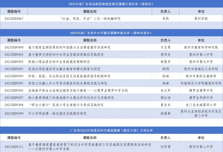 據(jù)了解,惠州學院的《“公益、思政、專業(yè)”三位一體創(chuàng)融研究》是惠州市唯一一個入選2023年度廣東省高校思想政治教育課題立項名單的課題,惠州市第八中學的《基于教育高質(zhì)量發(fā)展背景下的完全中學思政教育工作實施路徑及課程體系的研究——以惠州市第八中學為例》是惠州市唯一一個入選廣東省2023年度教育科學規(guī)劃課題(德育專項)立項名單的課題。