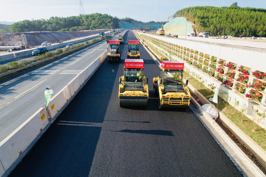項目瀝青試驗段攤鋪現(xiàn)場。惠州日報記者戴建 通訊員劉志浩攝