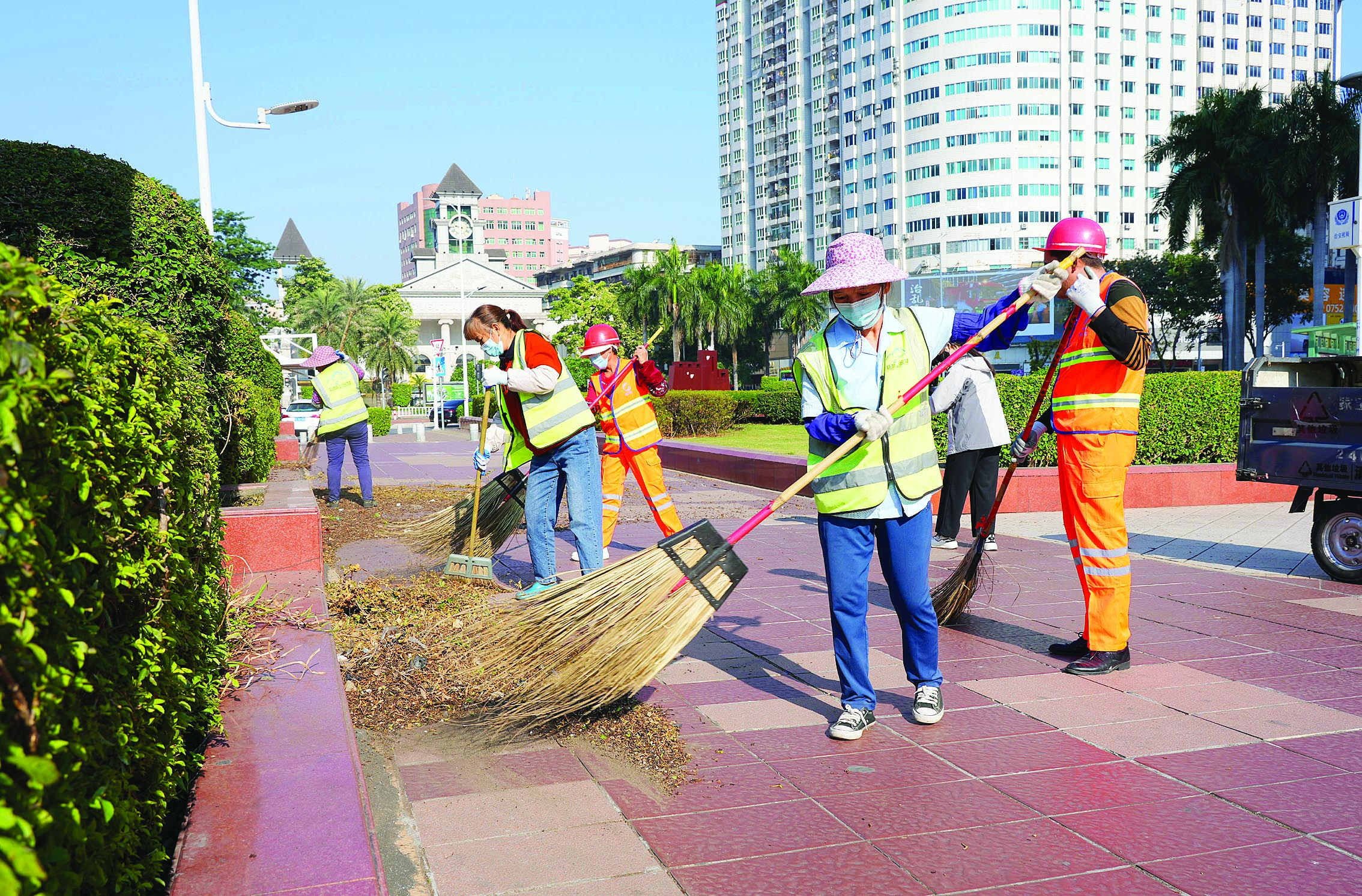 環(huán)衛(wèi)工人和園林工人清理綠化帶內(nèi)的垃圾。惠州日報記者張藝明 攝