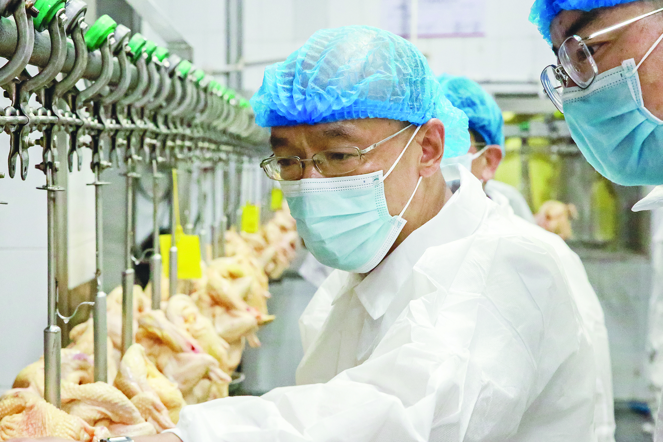 鄒勇(左二)到屠宰企業(yè)檢查畜產(chǎn)品質(zhì)量安全。