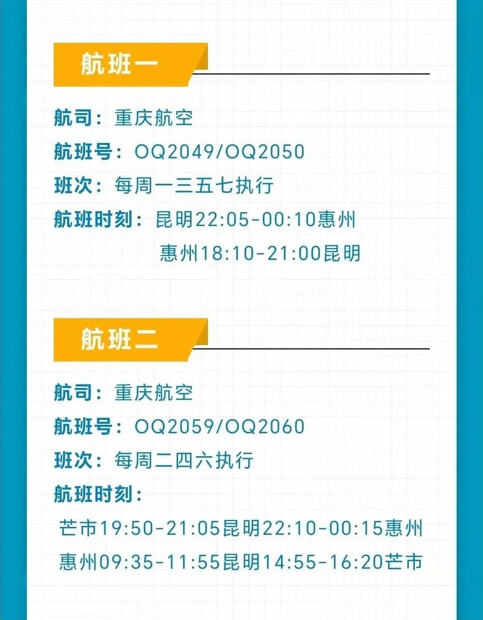 2023年11月26日起,重慶航空將開(kāi)通惠州直飛昆明的航線,每周一、三、五、七執(zhí)行。并于2023年11月28日起,開(kāi)通惠州飛昆明再飛芒市的航線,每周二、四、六執(zhí)行。