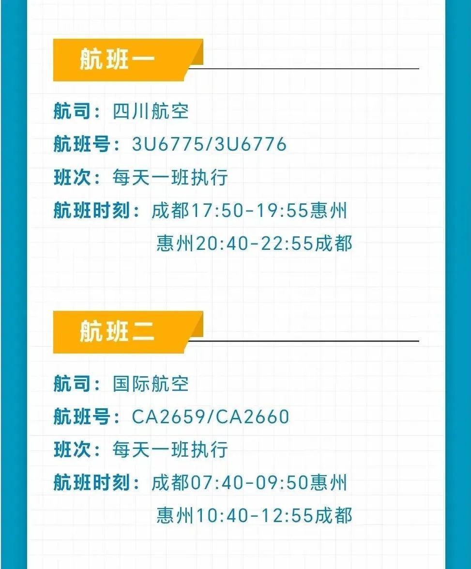 2024年1月26日起,四川航空將恢復(fù)惠州直飛成都天府航線,每天1班執(zhí)行。恢復(fù)后,惠州機(jī)場(chǎng)通往成都航班將由現(xiàn)在的每天1班,增加至每天2班。