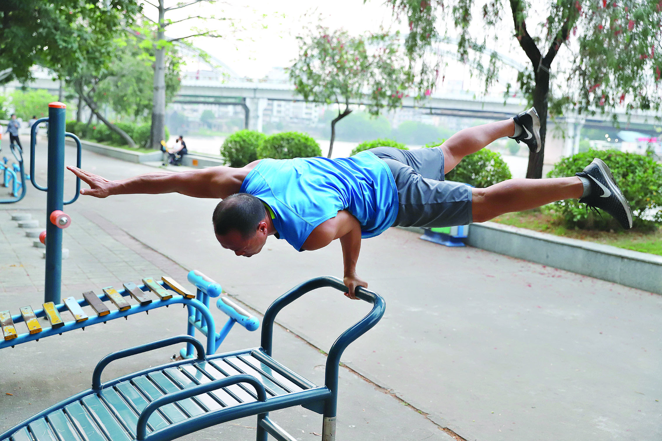 市民在運動器械上做出“單手頂立”的高難度動作。