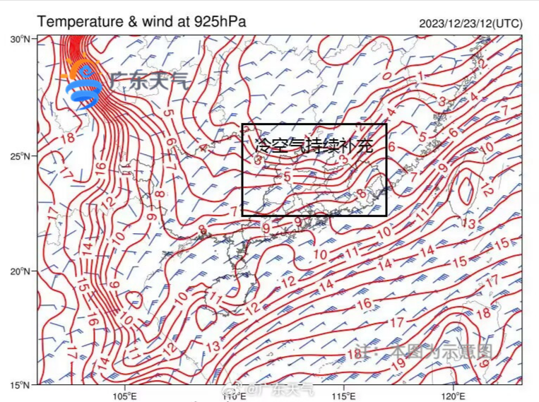 ·23-24日,500hpa有小波動槽,冷空氣持續(xù)補充,粵西云量增多,有零星小雨,其余多云到晴,氣溫繼續(xù)低位徘徊,粵北山區(qū)最低氣溫低于0℃,有霜凍或冰凍,中北部大范圍最低氣溫低于5℃。