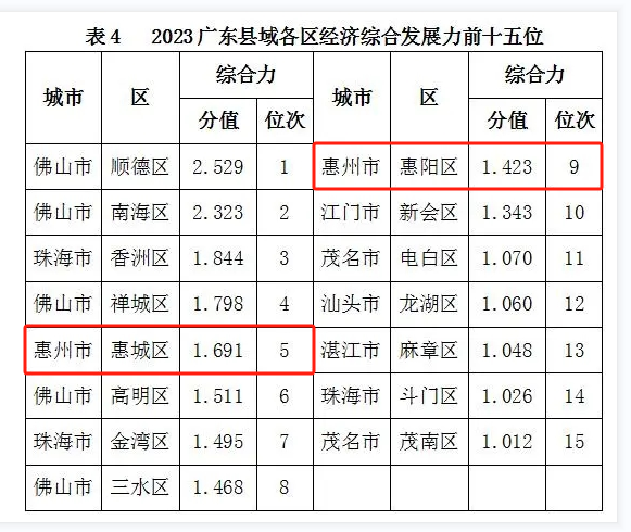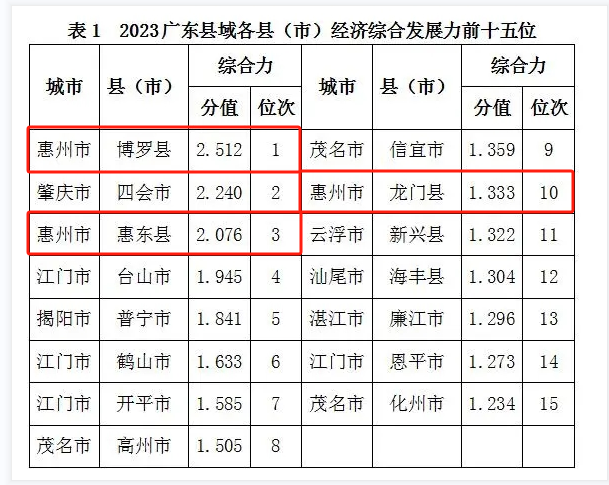 在縣(市)經(jīng)濟(jì)綜合發(fā)展力前15位中,珠三角占8席,剛剛超過一半。其中,惠州占3席(博羅、惠東、龍門),并拿下第一名;江門占4席(臺山、鶴山、開平、恩平),在珠三角城市中入選數(shù)量最多;肇慶占1席,為四會(居第2位)。