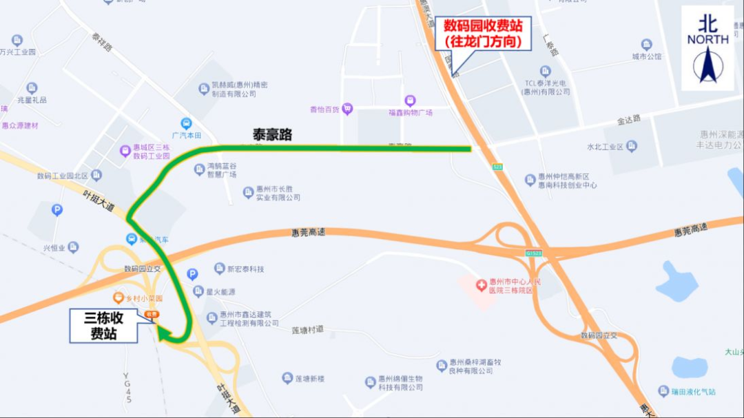 5.數(shù)碼園收費(fèi)站(往龍門方向):交通管制時(shí)間內(nèi),原計(jì)劃從數(shù)碼園收費(fèi)站入口上高速往龍門方向的貨車,可通過泰豪路→惠州南互通→三棟收費(fèi)站上高速。