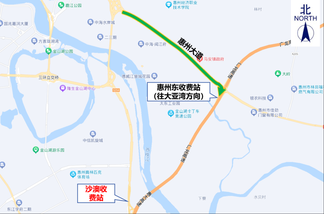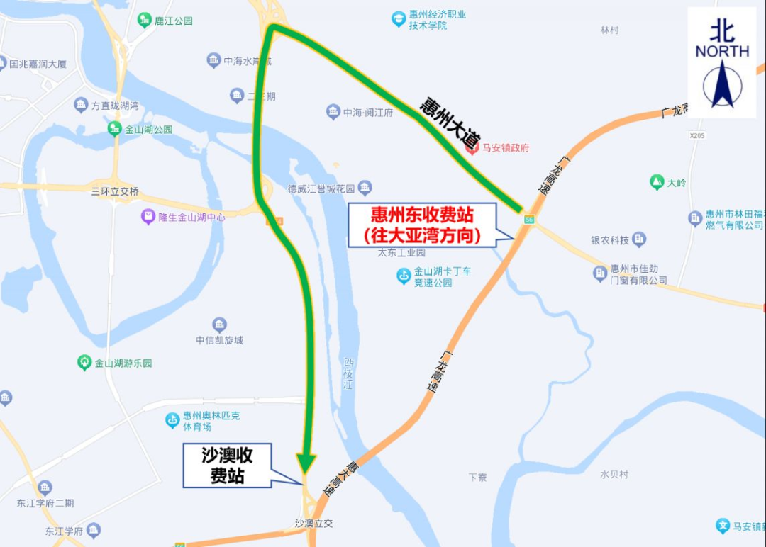 4.沙澳收費(fèi)站:交通管制時(shí)間內(nèi),原計(jì)劃從沙澳收費(fèi)站入口上高速往大亞灣方向的貨車,可通過惠州大道→惠州東收費(fèi)站(往大亞灣方向)上高速。