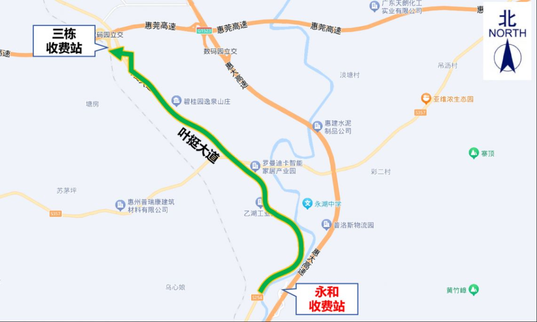 3.數(shù)碼園收費(fèi)站(往大亞灣方向):交通管制時(shí)間內(nèi),原計(jì)劃從數(shù)碼園收費(fèi)站上高速往大亞灣方向的貨車,可通過泰豪路→葉挺大道→三棟收費(fèi)站上高速。