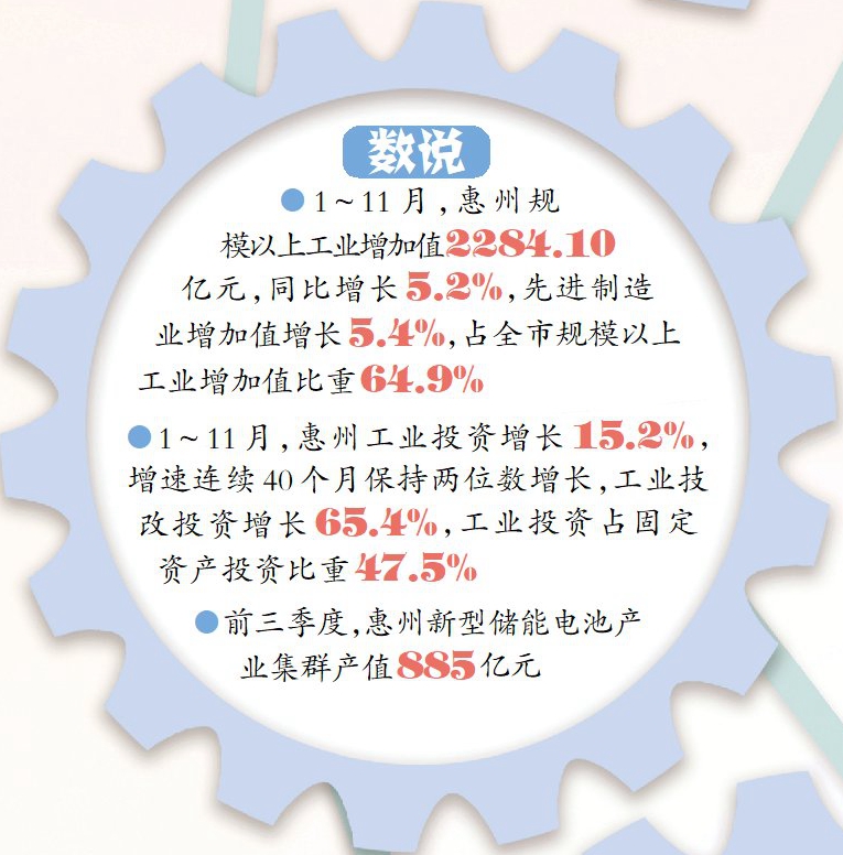 一年來,惠州引進一批標志性項目落地,呈現(xiàn)出央企、民企、外企同臺競技,以大帶小的生動局面。今年前三季度,惠州在建工業(yè)項目1569宗,總投資6880億元,超10億元項目135宗;工業(yè)投資總量居全省第2位,截至今年11月,增速連續(xù)40個月保持兩位數(shù)增長。