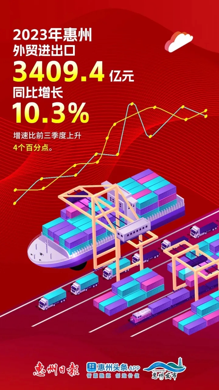 外貿方面。去年,惠州外貿進出口3409.4億元,同比增長10.3%,增速比前三季度上升4個百分點。其中,跨境電商進出口增長11%,成為新的外貿增長點。