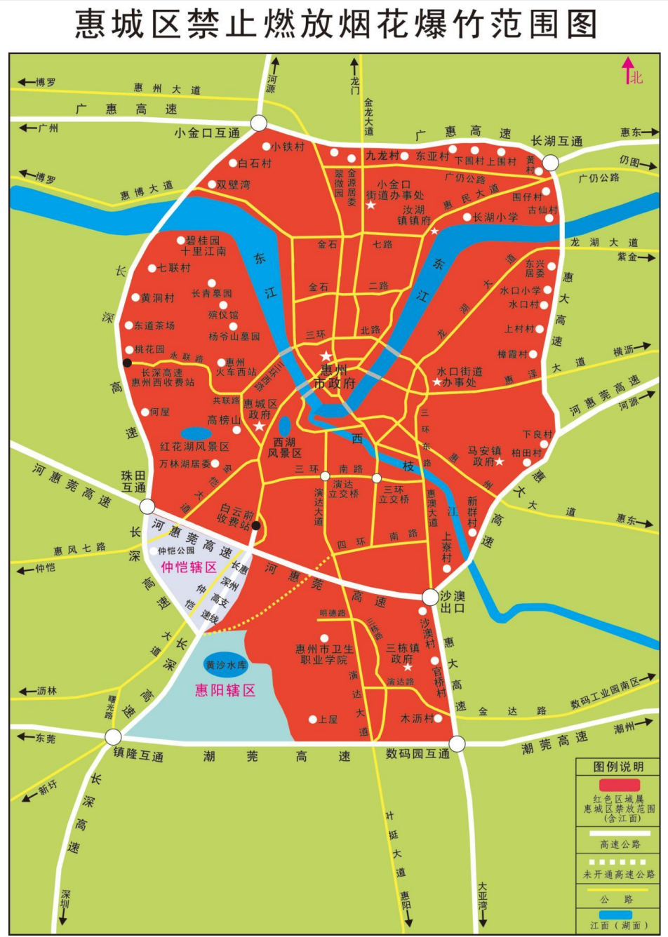 禁止燃放煙花爆竹的范圍:東起惠大高速長湖互通、惠大高速,止潮莞高速數(shù)碼園互通以西方向的惠城區(qū)管轄區(qū)域(含江面);南起潮莞高速數(shù)碼園互通、潮莞高速,止長深高速鎮(zhèn)隆互通以北方向的惠城區(qū)管轄區(qū)域(含江面);西起長深高速鎮(zhèn)隆互通、長深高速、長深高速惠州支線與河惠莞高速交叉處以東方向的惠城區(qū)管轄區(qū)域,沿河惠莞高速西北行至珠田互通以北方向的惠城區(qū)管轄區(qū)域,再沿長深高速北上,止廣惠高速小金口互通以東方向的惠城區(qū)管轄區(qū)域(含江面);北起廣惠高速小金口互通、廣惠高速,止惠大高速長湖互通以南方向的惠城區(qū)管轄區(qū)域(含江面)。