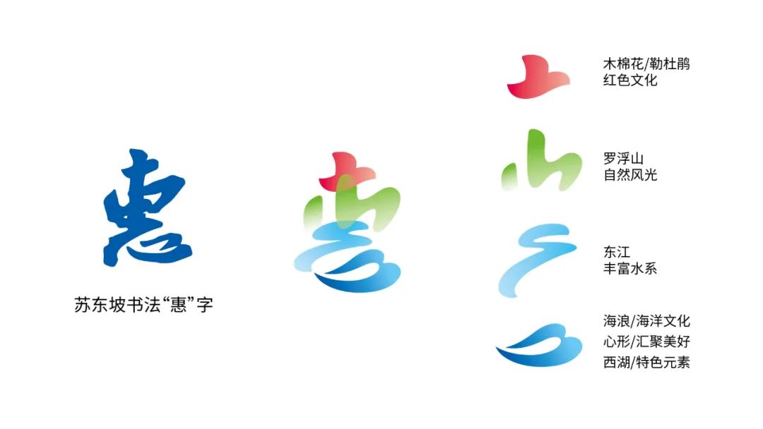 標(biāo)志整體造型由蘇東坡書法字體“惠”字創(chuàng)意變化而來,將城市品牌名稱與東坡文化進(jìn)行關(guān)聯(lián),同時(shí)強(qiáng)化惠州之“惠”的美好內(nèi)涵。其中,“惠”字頭紅色部分,象征城市英雄之花木棉花,同時(shí)形似市花勒杜鵑,是城市紅色文化的體現(xiàn);中間綠色部分,形似“山”字,突出惠州以羅浮山為代表的綠色自然;左側(cè)藍(lán)色線條部分,代表蜿蜒的“東江”,也表現(xiàn)惠州是具有豐富水系的城市。下面的藍(lán)色圖案形似翻滾的海浪,代表惠州獨(dú)具特色的海洋文化。同時(shí)又象征“中國西湖三十六,惟惠州足并杭州”的惠州西湖。