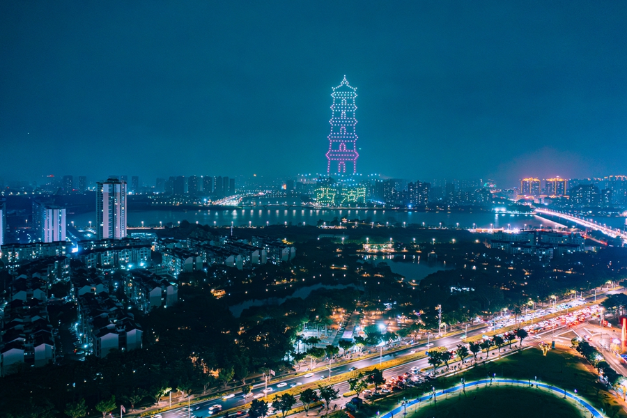 千架無(wú)人機(jī)在雨夜飛舞排列出西湖寶塔造型。